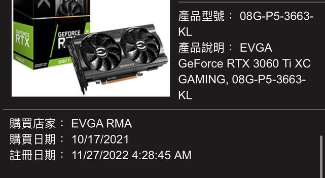 1. 2022/12/12 蝦皮原價屋 一手購入 2. 約2022/12前後 3. 2023/06/18 蝦皮Happytech旗艦店購入 4. EVGA RMA回來,無原裝彩盒,有RMA盒,保固日期依原卡的話為2026/10月,此部分會 再與EVGA客服確認