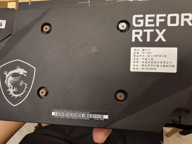 ◎硬體型號: MSI 3070 ventus 2x oc (禁止販售未拆封之物品,贈品、獎品、RMA品、
