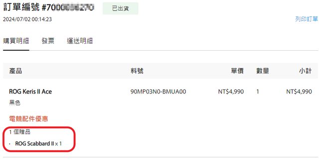 2024 - 7 月ASUS Store購買ROG Keris II Ace |的贈品