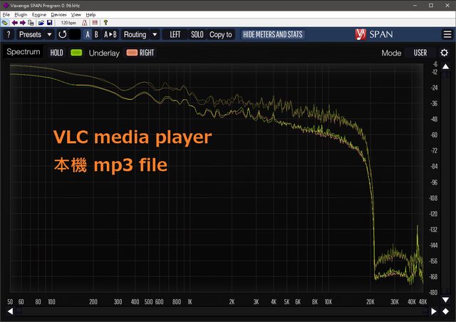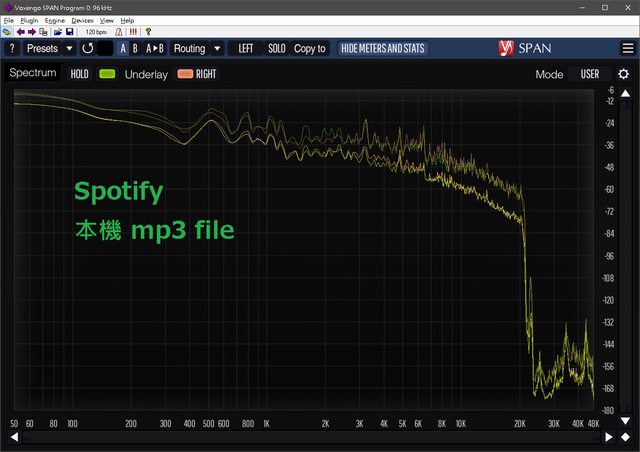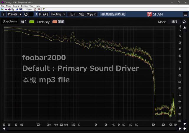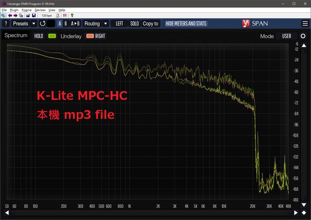 上述 mp3 file 由不同播放程式或輸出模式,經過 Windows 音效引擎後的頻譜