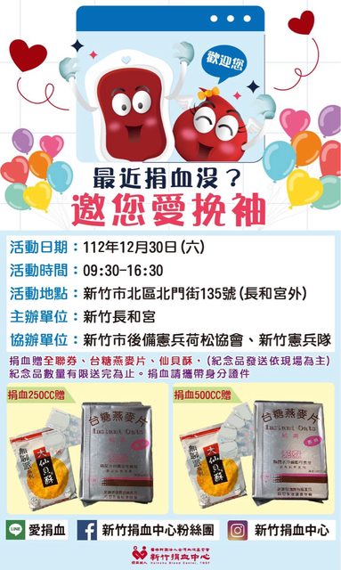標題[捐血] 12/30 新竹市長和宮捐血送全聯禮券