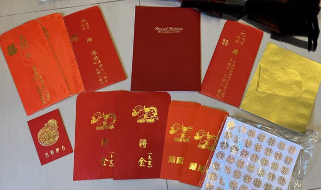 贈送米篩、禮金簿、喜字信封與貼紙等需自取
