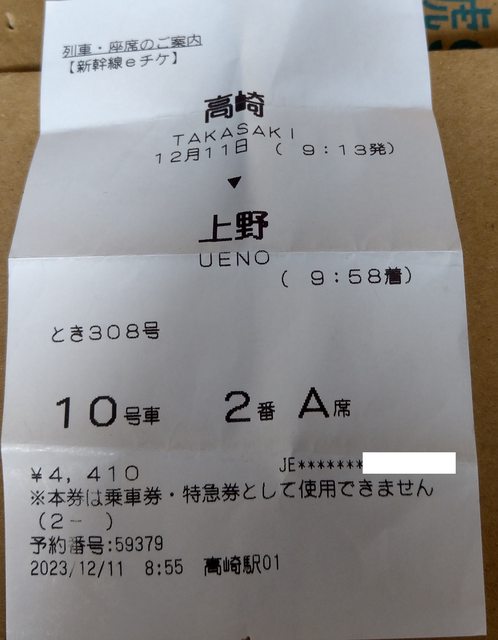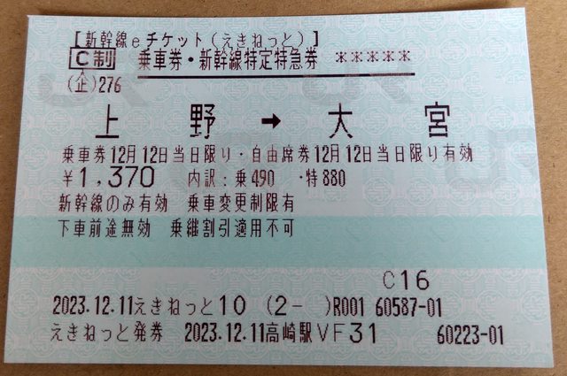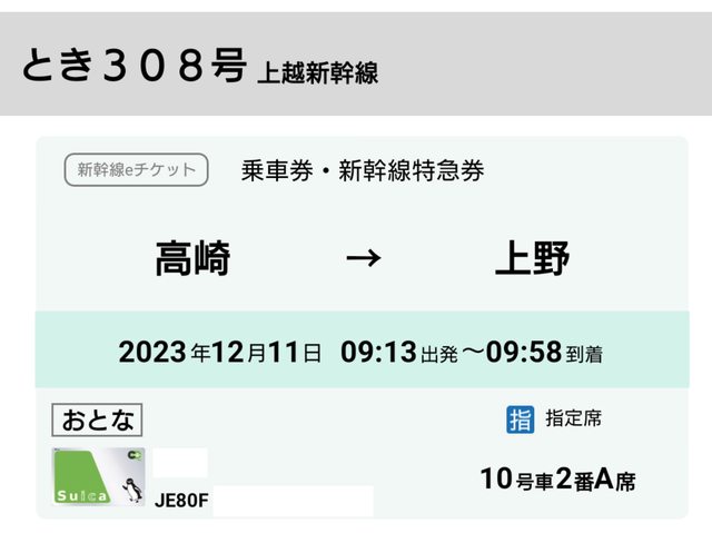 新幹線以一般紙本票從高崎--上野轉車至秋葉原,無須多付上野-秋葉原乘車費