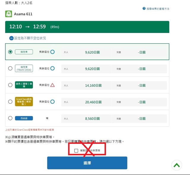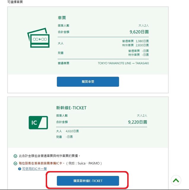 要使用新幹線E-TICKET,就不能勾選「僅購買特快車票等」
