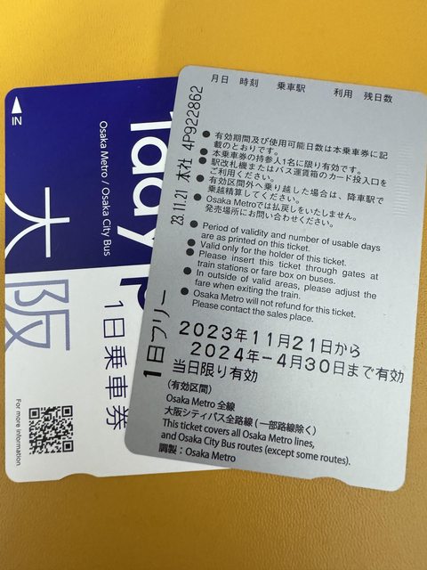 1. 讓售品項:大阪地鐵巴士一日乘車券2張