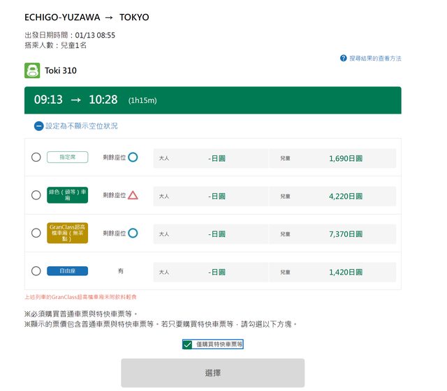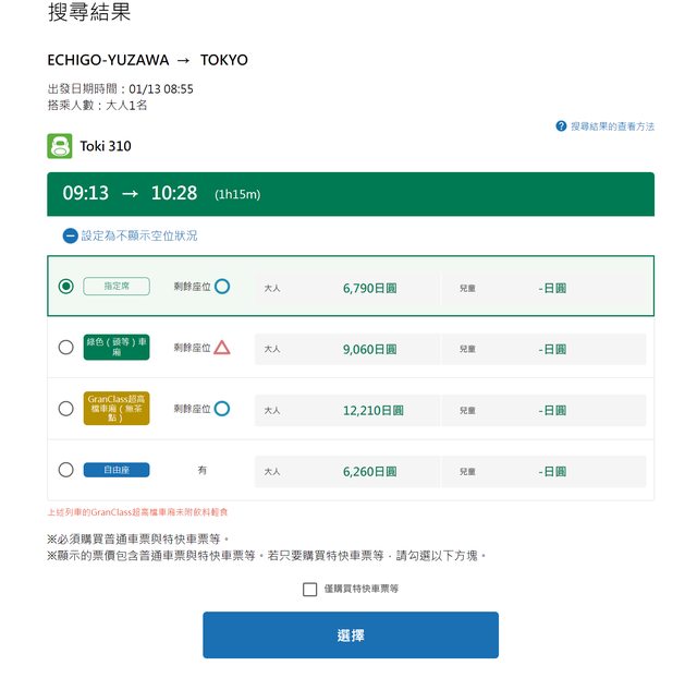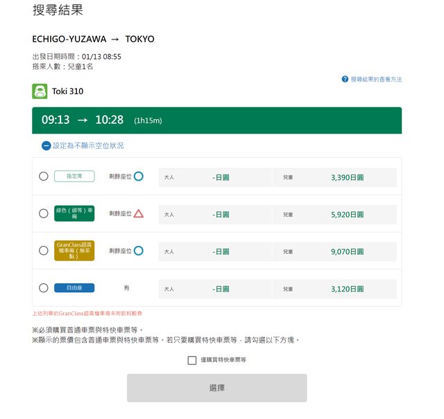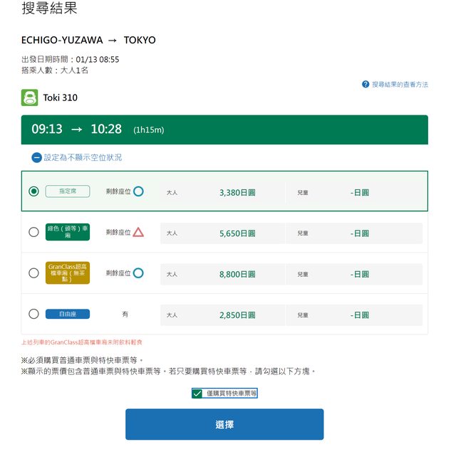 如果要使用特別車兩(綠車、GranClass),再加上特別車兩料金