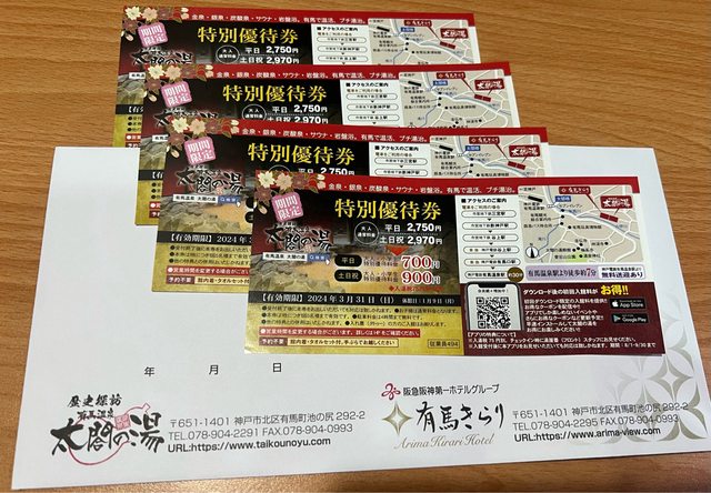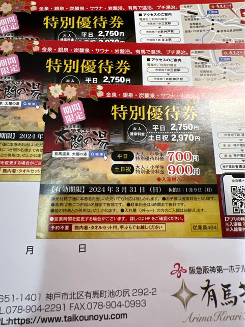 1. 讓售品項:日本有馬溫泉-太閣之湯特別優惠券-憑券平日入場700元日幣、假日入場90