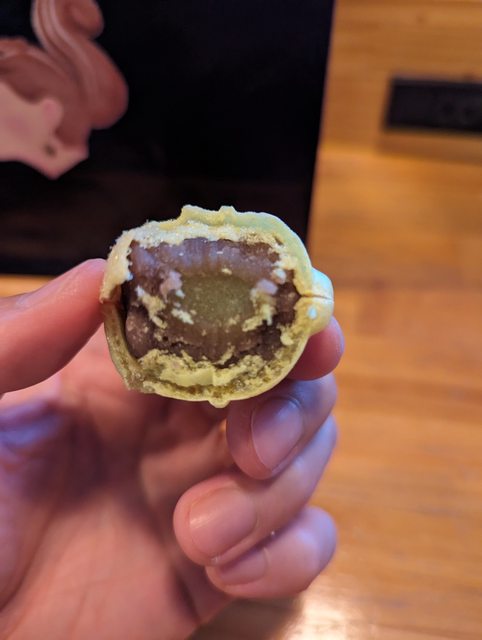 左邊普通口味的還可以,木莓口味的咬下去有點驚艷,酸味跟巧克力搭配得很好,85分。