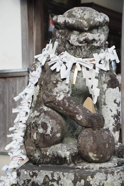 神社內的狛犬,脖子都掛滿了籤詩