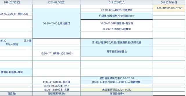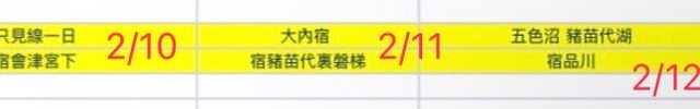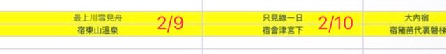 1. 螢光黃色欄位的那幾日是在考慮福島行程是否調換天數順序,主要是考量到交通順暢
