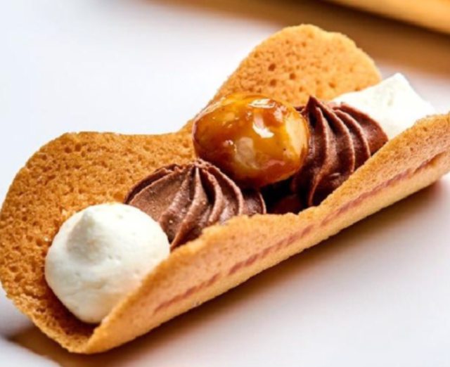 貓舌餅乾承載巧克力奶油和榛果,巧克力味道很香濃。