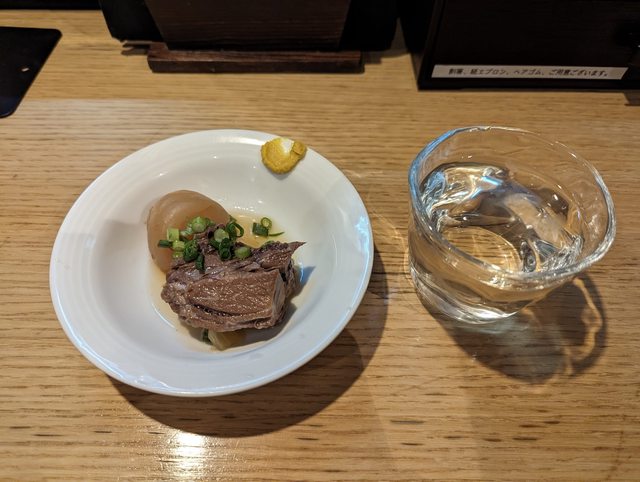 在外面走路走到有點冷,先點了一杯清酒來喝,店員送上的お通し是燉牛舌跟蒟蒻