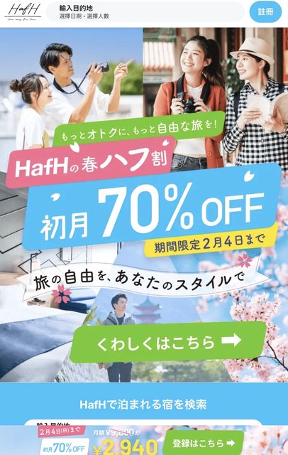 HafH是日本的一個訂閱制旅宿服務,目前優惠活動截止到2/4!