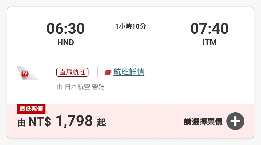 推 TheoEpstein : JAL那個1700台幣的是羽田出發到伊丹喔 02/04 14:37
