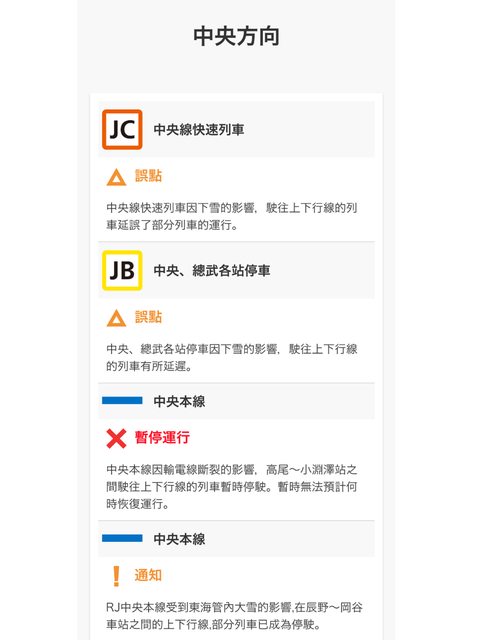 只看到中央線快速列車目前顯示「誤點」