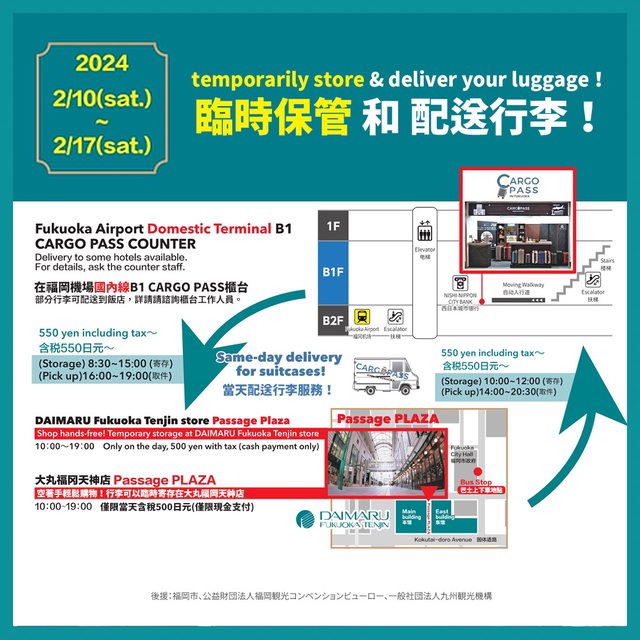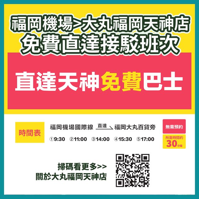 半年前曾限時推出從福岡機場到大丸福岡天神店(近天神地下街)免費接駁車,今年再次