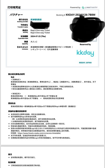 單程 關西機場-難波站 2張