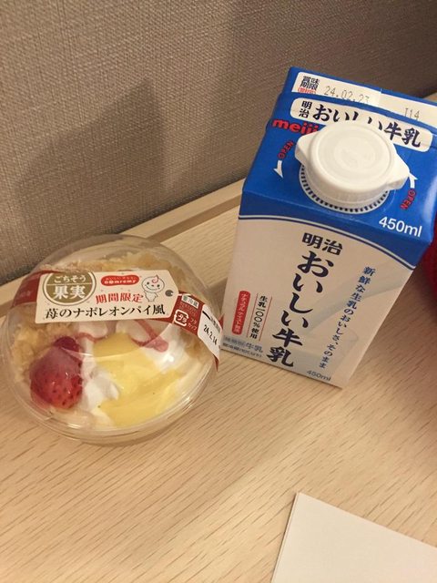 第一天晚上用AEON超市買的甜點跟明治おいしい牛乳結束來日本的第一晚。