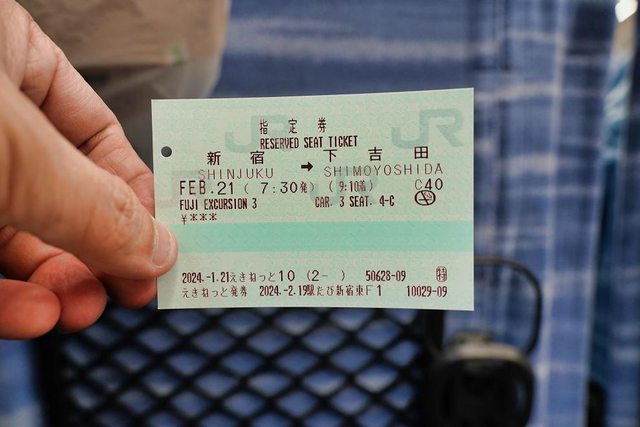 既然沒辦法像預期的到處散步看不同角度的富士山 加上很後悔前1天沒買小網神社的腕輪守 就直接回程新宿再去小網神社1次XD 回程搭下午1點26分出發的富士山ビュー特急(富士山景觀特急)4號往大月 有拿JR東京廣域周遊券的話坐自由席不用再付錢 如果要坐指定席的話需要在車上補票200円 我們平日搭自由席還很多空位