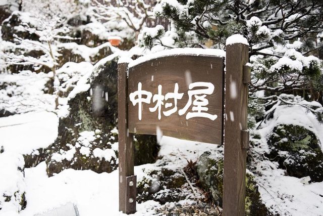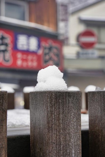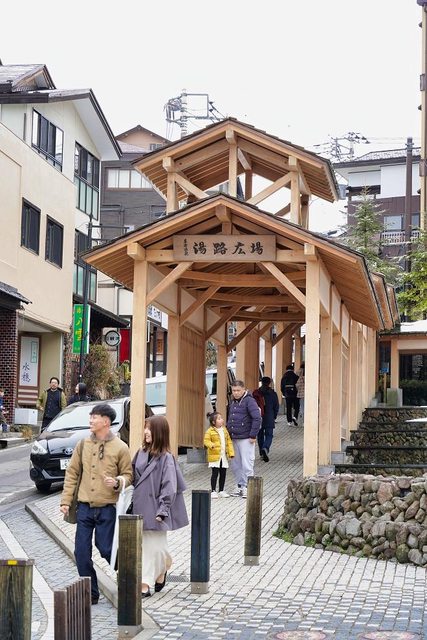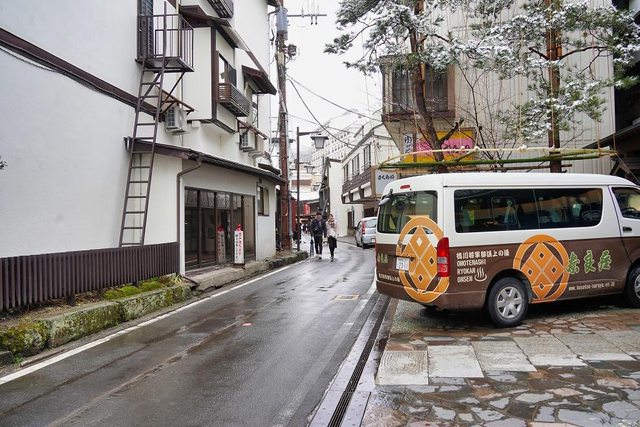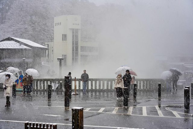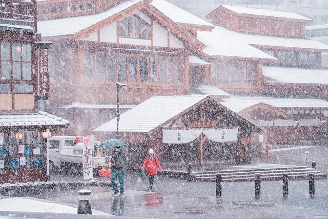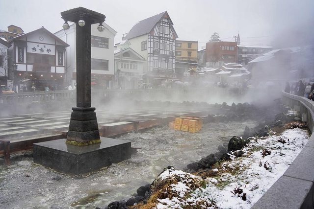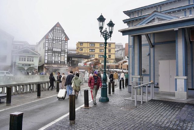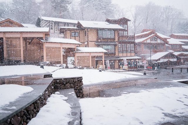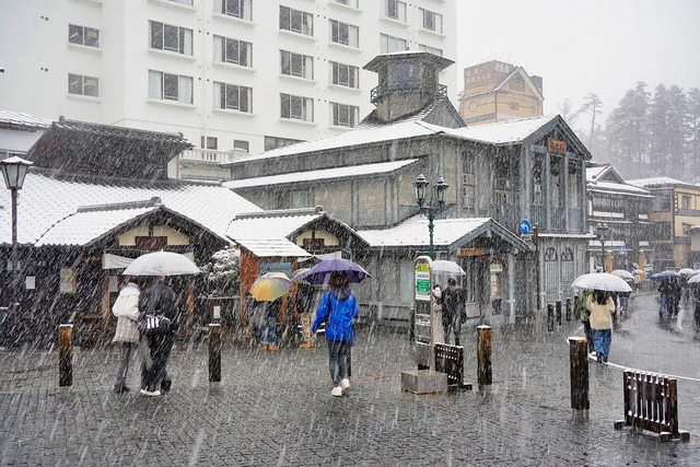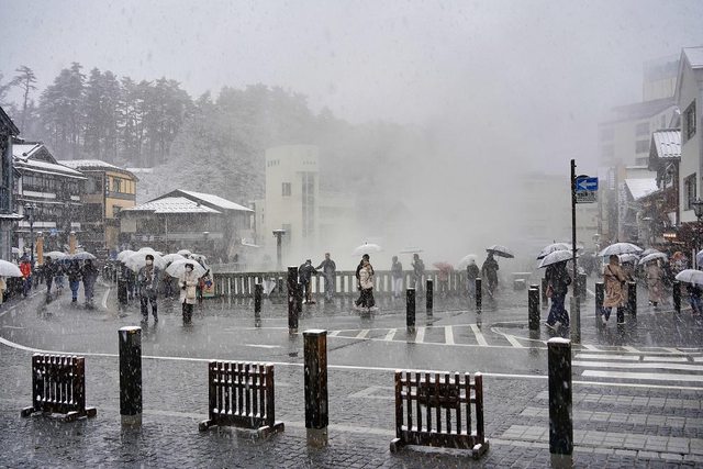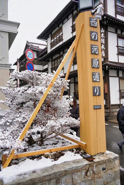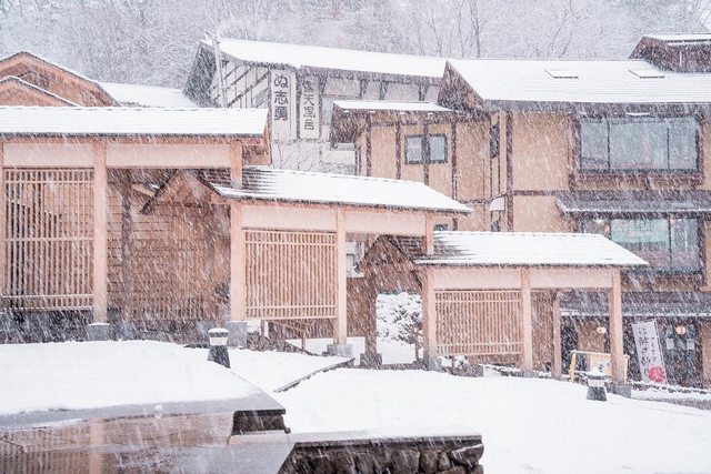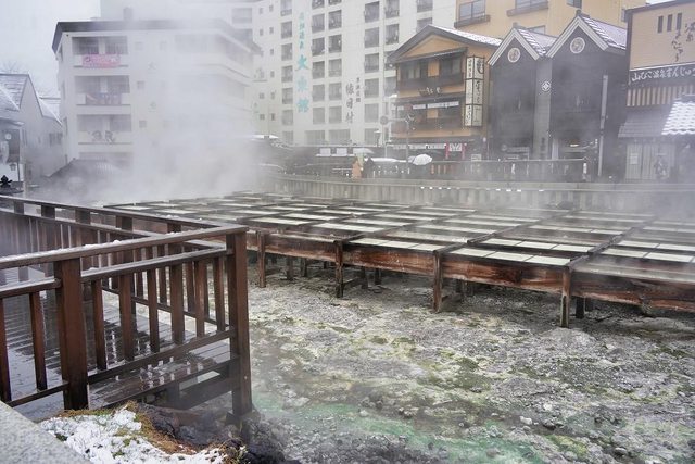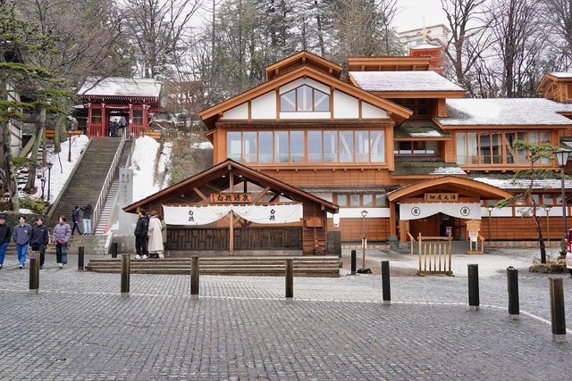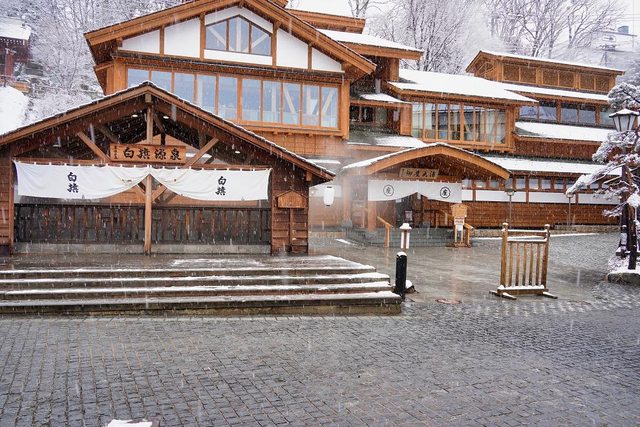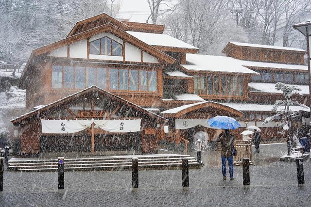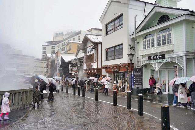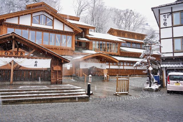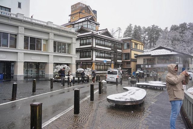 湯畑南側有一些浴場和旅館 雪真的超大也超漂亮