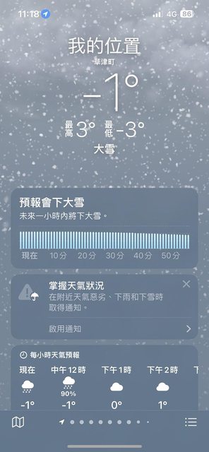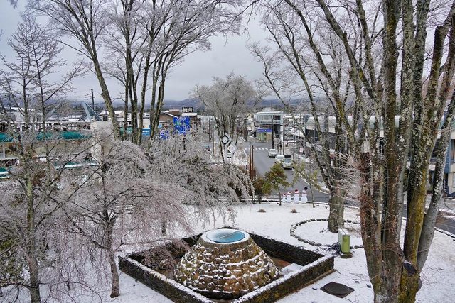 上車的時候記得抽整理券 不過這臺巴士抽整理券的機器很小 很多人上車都在找機器 往草津溫泉的路上 一開始還在下雨 巴士經過結冰的樹枝一直發出碰撞的聲音 隨著氣溫愈來愈低 過半小時後變成下大雪 很佩服司機這樣還能看到路 在11點11分抵達草津溫泉巴士站 我們準備了剛好的鈔票和零錢 司機就把整理券和錢一直收走幫我們投機器了