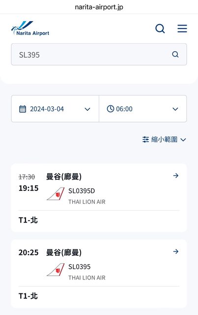 那時候就躺在床上滑了一下成田航班資訊 看到時間好像被延後兩小時,我坐的班機號碼變成SL395D,19:15飛 另一班是3/4從台北過來的SL395,20:25飛 https://i.imgur.com/Pni7v4Z.jpeg