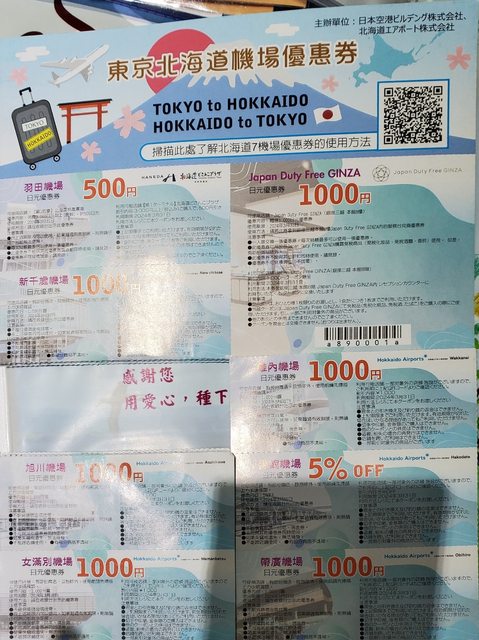 1. 東京北海道機場優惠券*N (大部分是滿三千折一千)