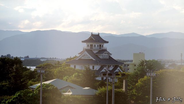 往右側閃過大型飯店,雖然前方還是有點"邪魔"的停車場景觀,但長浜城天守真真確確的