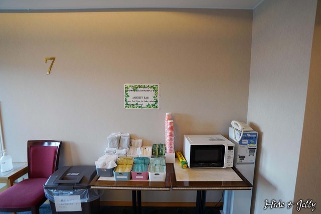 我們的房間被安排在客房頂層的7樓,一出電梯就可以看到備品吧,有盥洗備品、茶包、