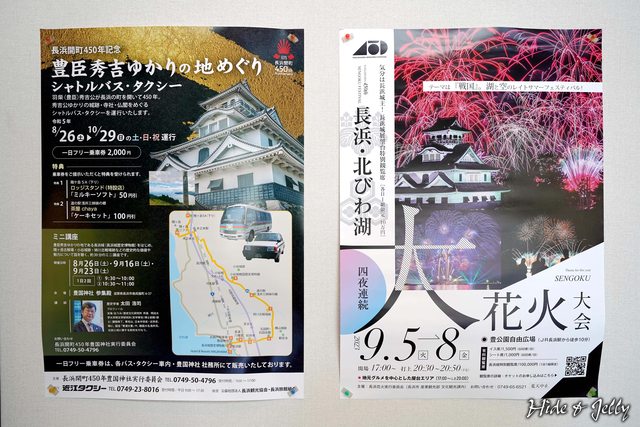 另外還有「長浜.北琵琶湖大花火大會」與建城450周年的特別巡迴列車海報,海報上的