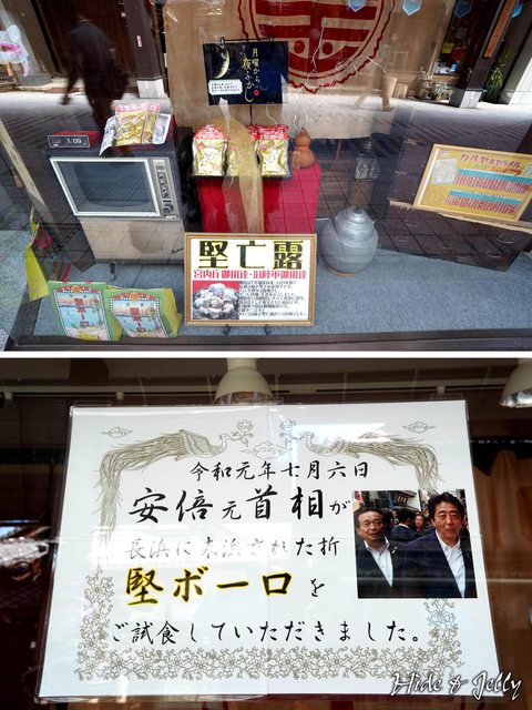 果啊!下方還貼著已故前首相安倍總理造訪長浜時,口含「堅亡露」的照片,呃~我們什