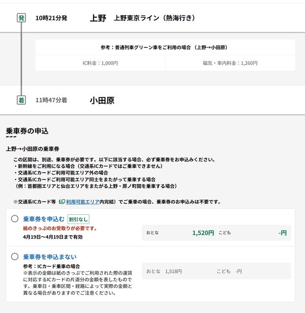 為單位),並且有適用區域,其中上野到小田原紙本票應為1520円