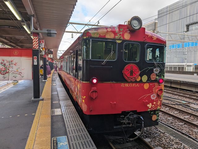 花嫁暖簾列車塗裝是紅金色為主,另飾以輪島塗及加賀友禪圖樣,一號車廂的入口以及車