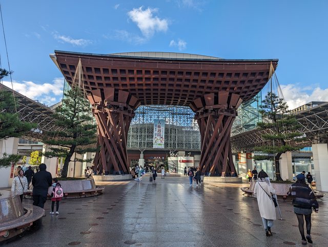 門位於金澤站的東口,是以日本傳統小鼓為藍本的巨大木製構造。後方的玻璃圓頂則是因