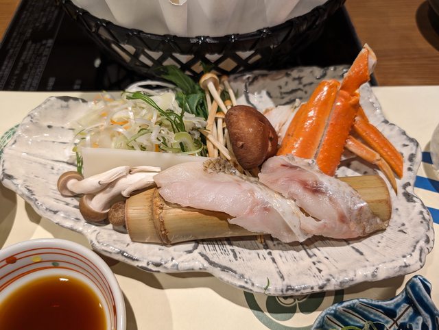 晚餐是螃蟹餐,主餐是螃蟹鍋跟涮鯛魚。先將鯛魚片在鍋裡涮熟後吃掉,再放入野菜跟蟹