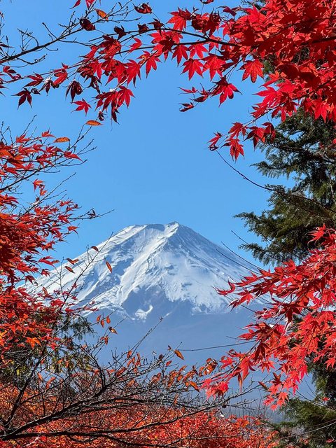 這次民宿特別挑選在「新倉山淺間神社」旁,走路只要五分鐘,早起出發還能避開人潮,也因為這樣才可以慢慢的調好角度拍照,剛好11月底楓葉還是正紅,這張以富士山為主體,周邊圍繞楓葉與藍天,真的是絕配的組合!