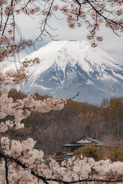 當初到富士山就打算搭公車隨性亂逛拍照,忍野八海這個點就是在公車上看到僅存的一小區櫻花,背景剛好就是富士山,想都不想馬上按鈴下車,把握富士山能見度還有時瘋狂拍,這裡的櫻花小朵淺粉色,搭配灰灰的富士山,整個色調意外的協調溫和。