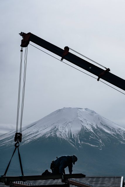 這次是獨旅所以時間非常自由,搭公車前往山中湖時,刻意提前一站下車沿著湖泊邊走邊拍,途中看到正在施工職人們,剛好背景又是富士山,用長鏡頭壓縮畫面,讓人物和富士山更貼近,其實這角度我在現場等了30分鐘,等工人慢慢地移動到適合的位置,同時見識到日本職人對工作的細心態度。