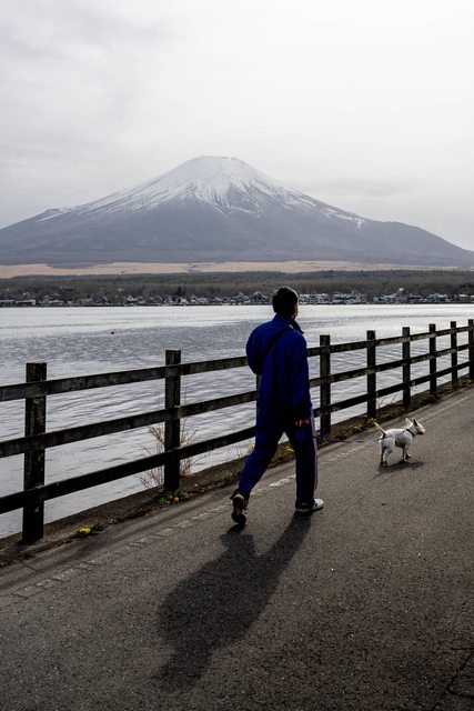 在湖邊四處遊蕩看美景時,發現有當地居民在遛狗,趕快拿起相機捕捉這溫馨的畫面。拍下這張照片的同時,也羨慕主人和狗狗,可以每天在富士山的陪伴下,愜意的在湖邊散步。