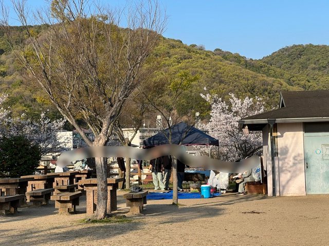 御山公園:路邊一排櫻花,公園能烤肉,當地居民正在烤肉,超嗨。旁邊棒球場小孩們正