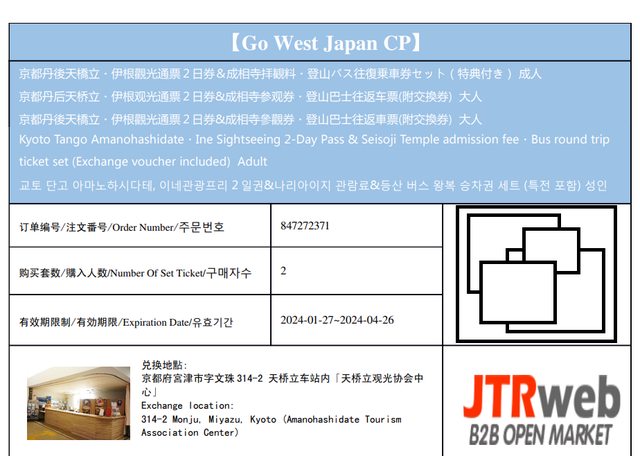京都丹後天橋立・伊根觀光通票 2 日券&成相寺參觀券・登山巴士往返車票(附交換券)