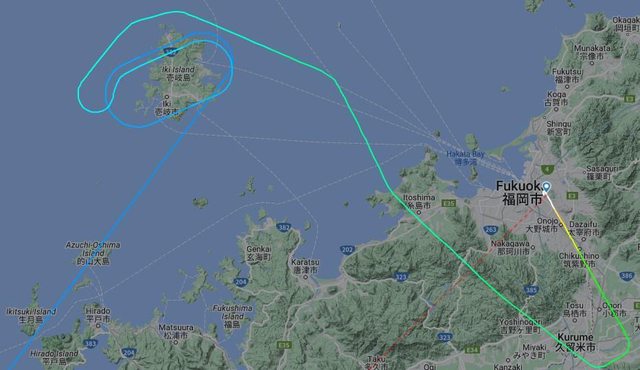 事後查了一下FR24,在壹歧島上方盤旋了2圈,落地也因此延誤半小時左右