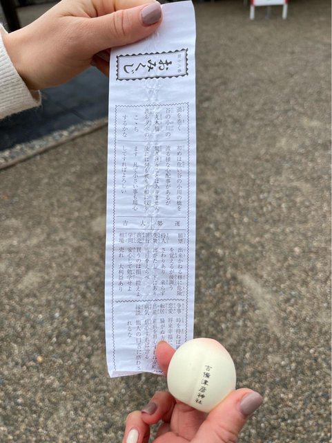 參拜神社後,求了個桃子造型的神籤、大吉。