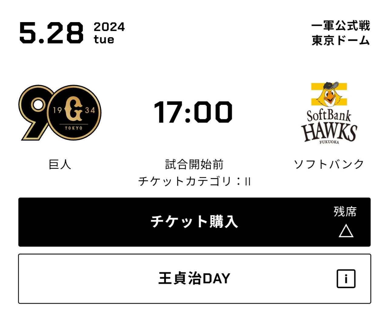 2024/05/28 18:00巨人vs軟銀(球票*4張連號)