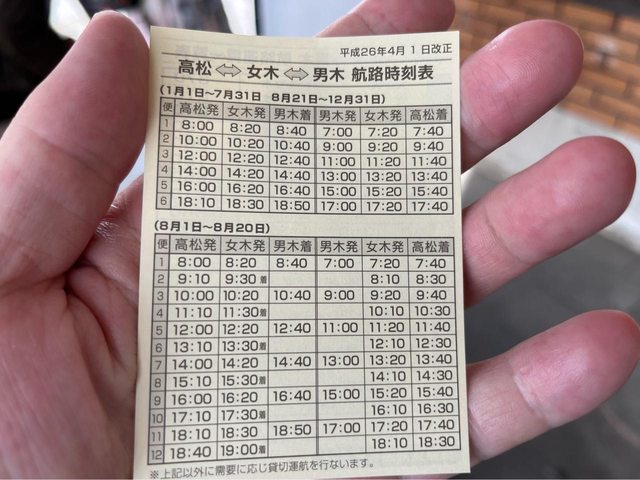 一天有6趟(男木》女木》高松》女木》男木),到女木島的票價為370円。