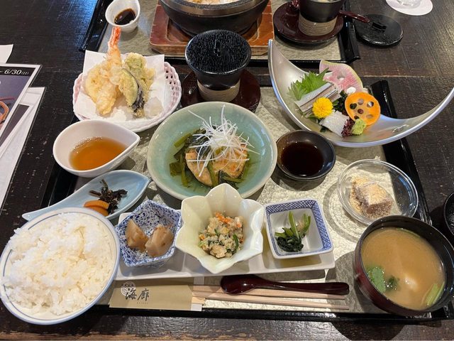 泡完湯肚子也餓了,就在會館內用餐(進會館會提供手環,各式消費都記錄在手環,離開 時在櫃檯結帳)。餐點精緻好吃,費用也合理(這兩套共3,600円)。