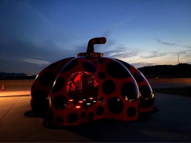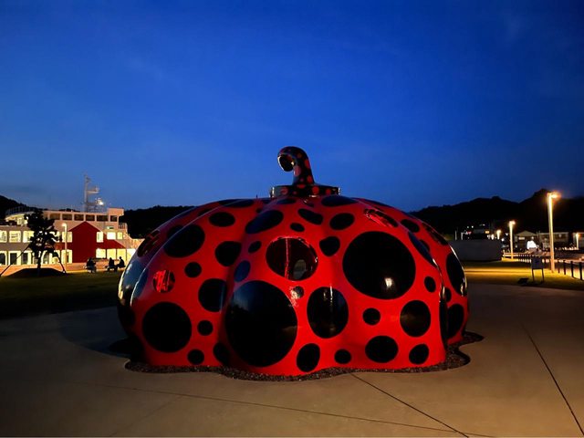 晚上搭接駁車到宮浦港附近買晚餐,順便看一下夜晚的紅南瓜(外部打燈、內部也有點燈 )。