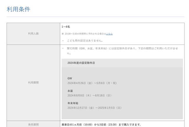 發售期間是乘車日前6天到前1天、不限車種自由席、可適用小孩、最多6人(1-6人)