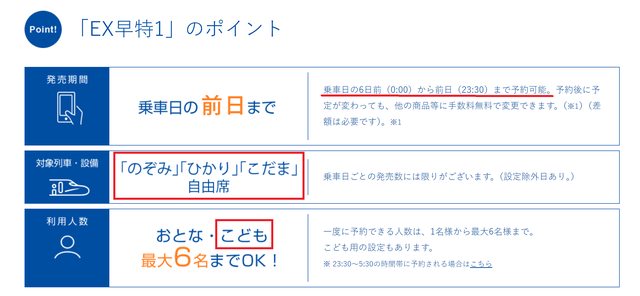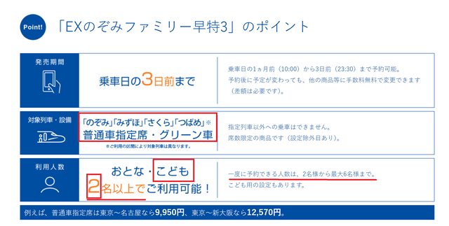 右圖「EXのぞみファミリー早特3」早鳥票,利用人數最少為2人最多6人、適用小孩、