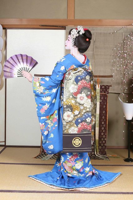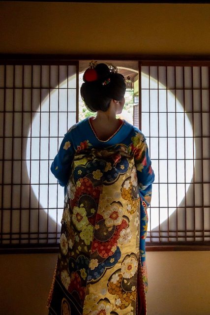 像是相較藝妓,舞妓的髮型會梳得圓一點、和服花色較花、內裡也花